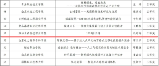 近日,第九届山东省黄炎培职业教育创新创业大赛和第二届潍坊市黄炎培职业教育创新创业大赛分别圆满落幕。我校师生凭借扎实的专业素养与创新实践能力,荣获高职学生组山东省三等奖一项、高职教师组潍坊市三等奖一项、高职学生组潍坊市三等奖一项。
