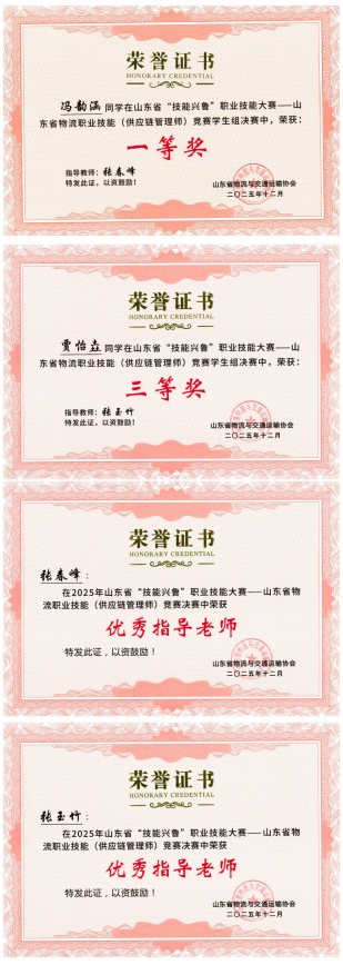 近日,山东省“技能兴鲁”职业技能大赛——山东省物流职业技能(供应链管理师)竞赛圆满落幕。管理学院教师张玉竹、张春峰指导的数字商贸系学子凭借扎实的专业功底、出色的实践能力和默契的团队协作,在众多参赛队伍中脱颖而出,最终斩获一等奖和三等奖的优异成绩,为学校赢得了荣誉。