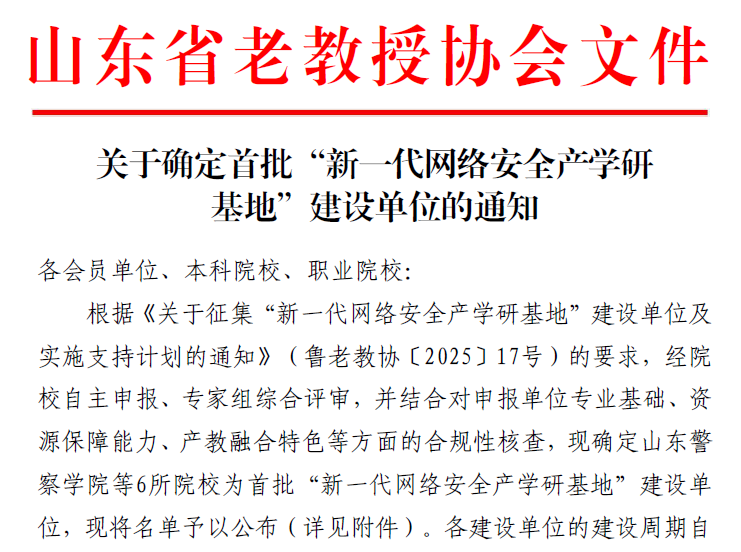 近日,根据山东省老教授协会发布的《关于确定首批“新一代网络安全产学研基地”建设单位的通知》(鲁老教协〔2025〕17号),经院校自主申报、专家组综合评审及合规性核查,我校凭借扎实的专业基础、卓越的产教融合特色和雄厚的资源保障能力,获批山东省老教授协会项目立项,成为首批“新一代网络安全产学研基地”建设单位之一。这是我校在深化“产、教、学、研一体化”办学模式、拓展新工科建设领域取得的又一重大突破,标志着学校在服务国家网络强国战略、培养高素质网络安全技术技能人才方面迈入了全新的发展阶段。